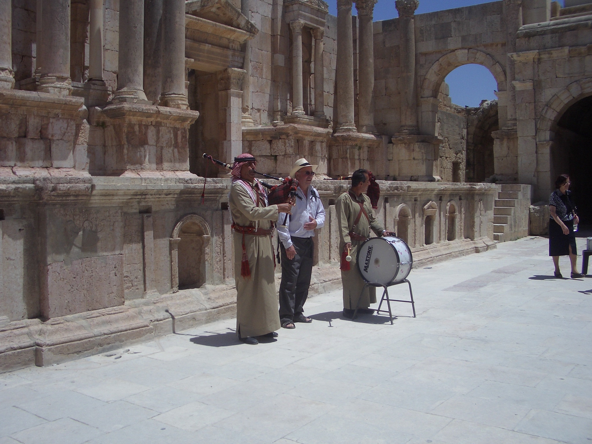 Visiting the amphitheatre in Jerash we came across two men playing bagpipes and drum and I sang “Bratach Bana” in Gaelic with them for the tourists.